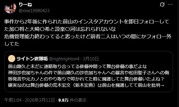 | … | 128無念Nameとしあき26/03/11(水)21:01:58No.1393199331そうだねx3>でも庇う舞台俳優仲間はいるから⋯ |