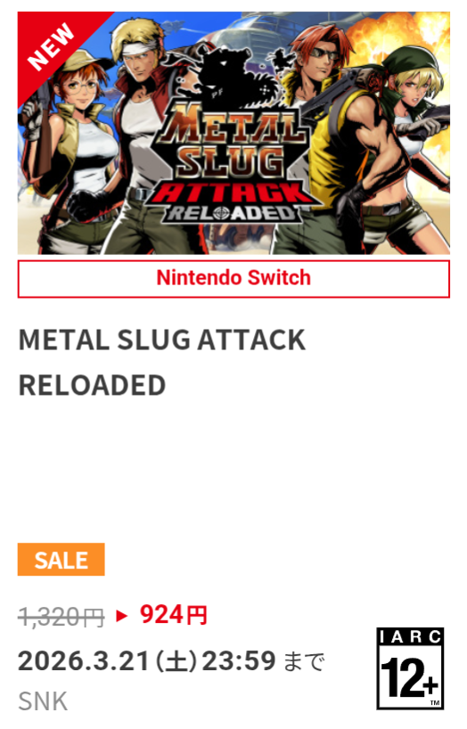 | … | 10無念Nameとしあき26/03/12(木)00:00:19No.1393245375+ 1773241219956.png-(318717 B) メタルスラッグアタックがセール中! |