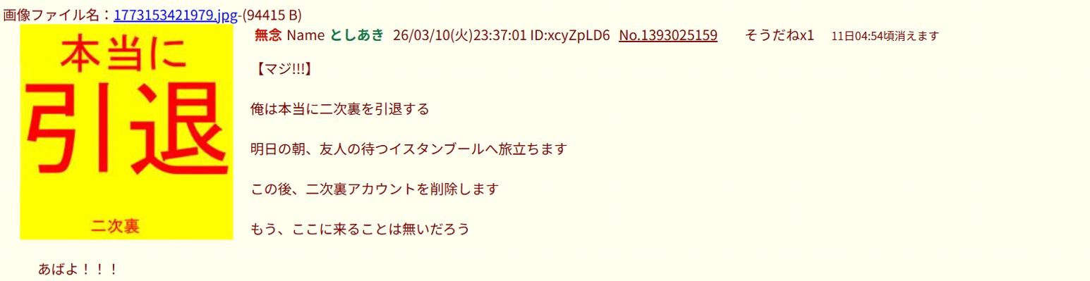 | … | 39無念Nameとしあき26/03/12(木)00:15:57No.1393248424+>【これだけは言って置く】 |