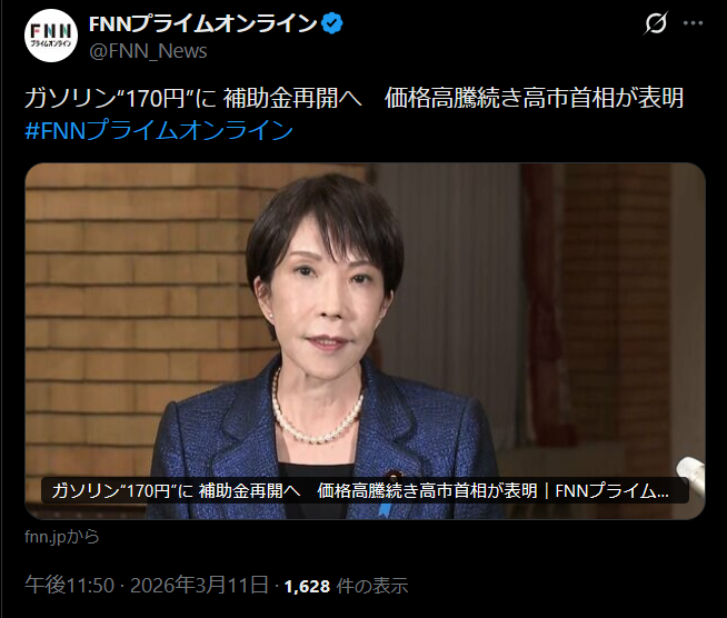 | … | 32無念Nameとしあき26/03/12(木)01:54:34No.1393261359そうだねx2 1773248074861.jpg-(869721 B) >原油高になったのは高市のせいじゃなく余計な戦争仕掛けたイスラエルとネタニヤフのせいやろ誰が原因かちゃんと見ろよ |