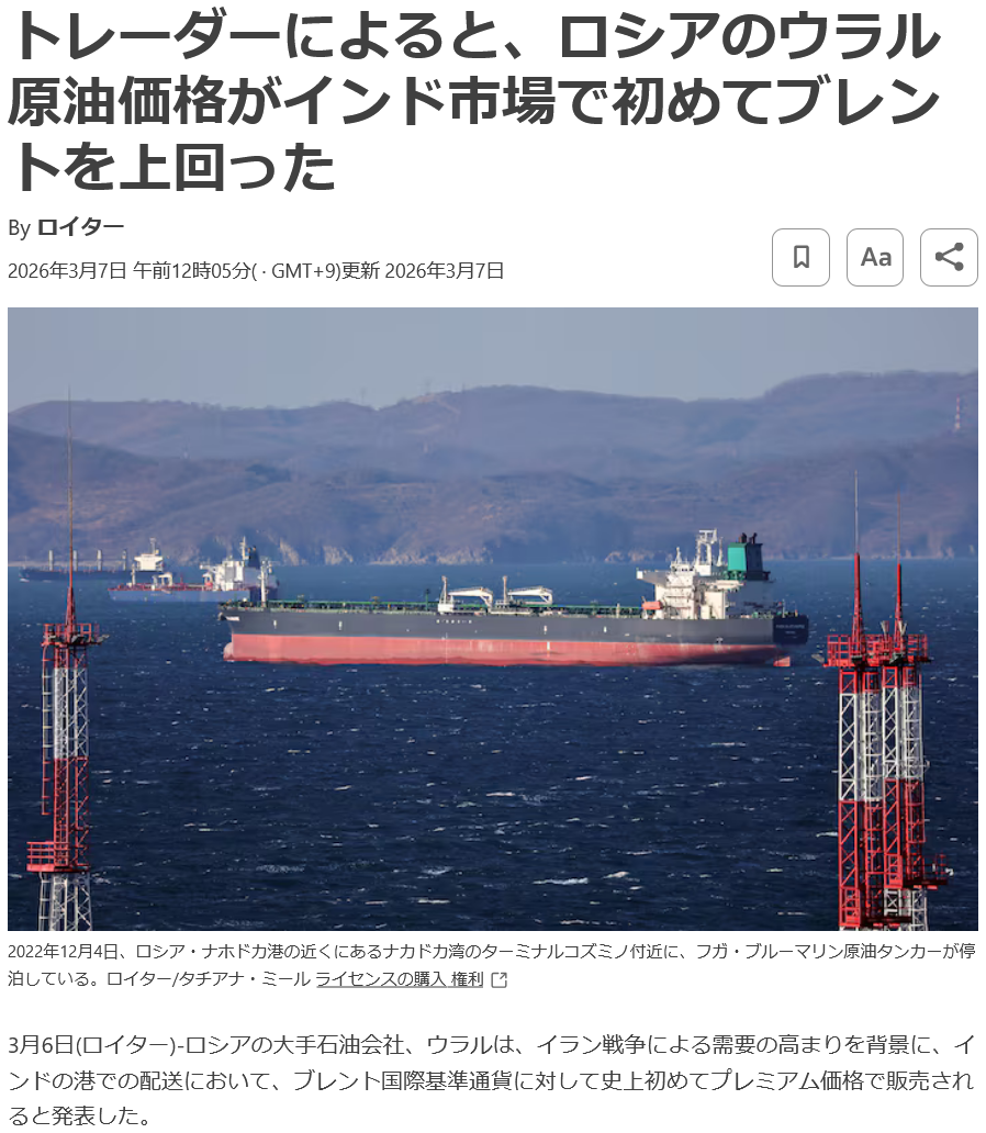 | … | 79無念Nameとしあき26/03/12(木)03:35:39No.1393266470+>原油急騰ロシア1人勝ちへ |