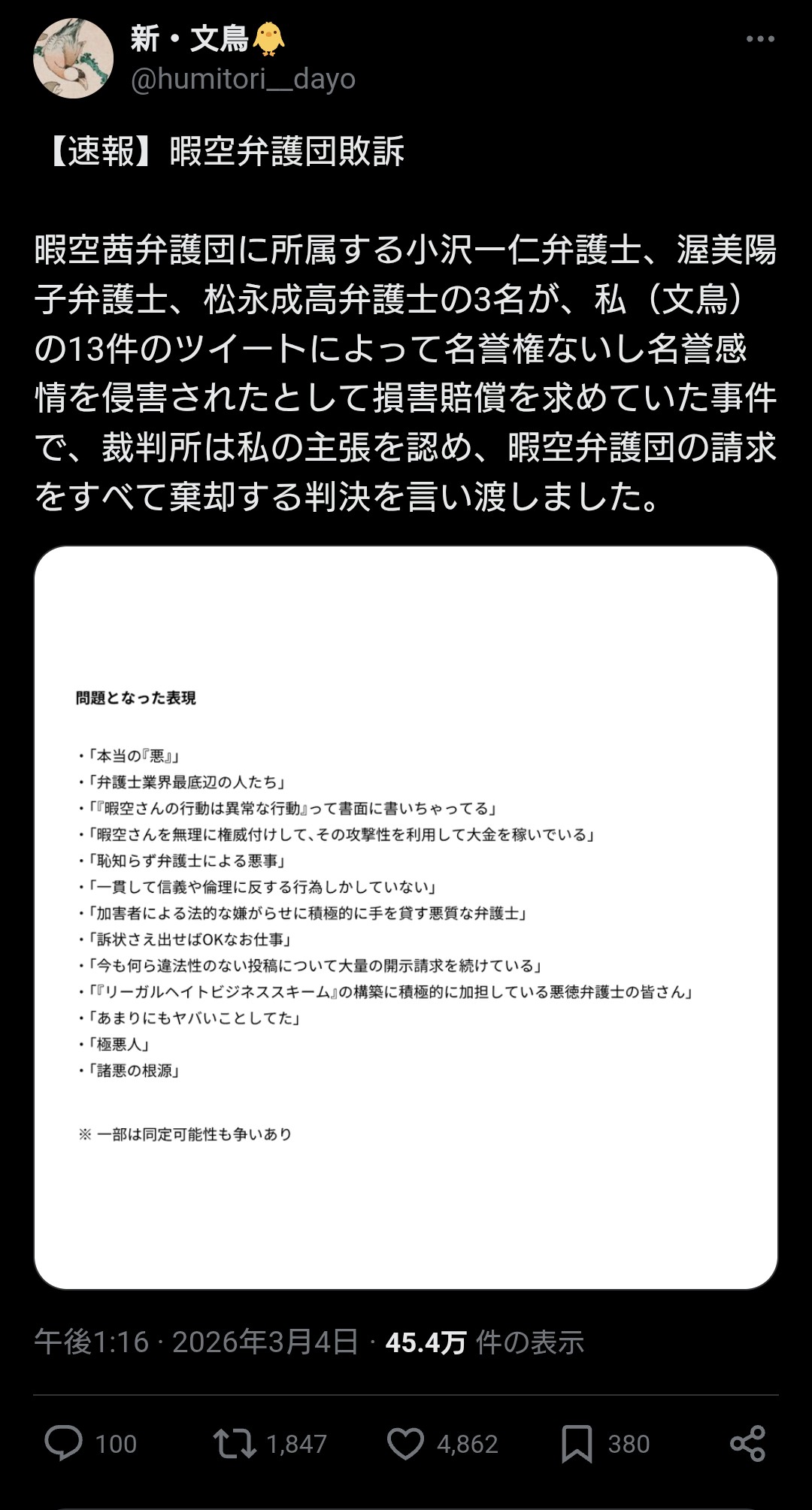 | … | 13無念Nameとしあき26/03/12(木)09:23:17 ID:tmOQcpzINo.1393287910そうだねx3 1773274997493.jpg-(257472 B) 弁護士3人がかりで素人1人に負ける暇空弁護団 |