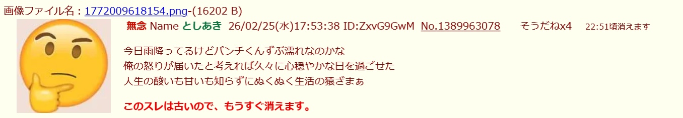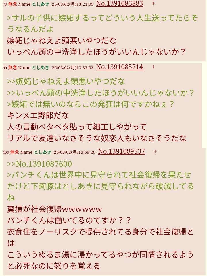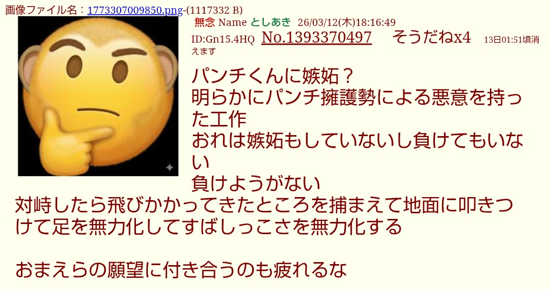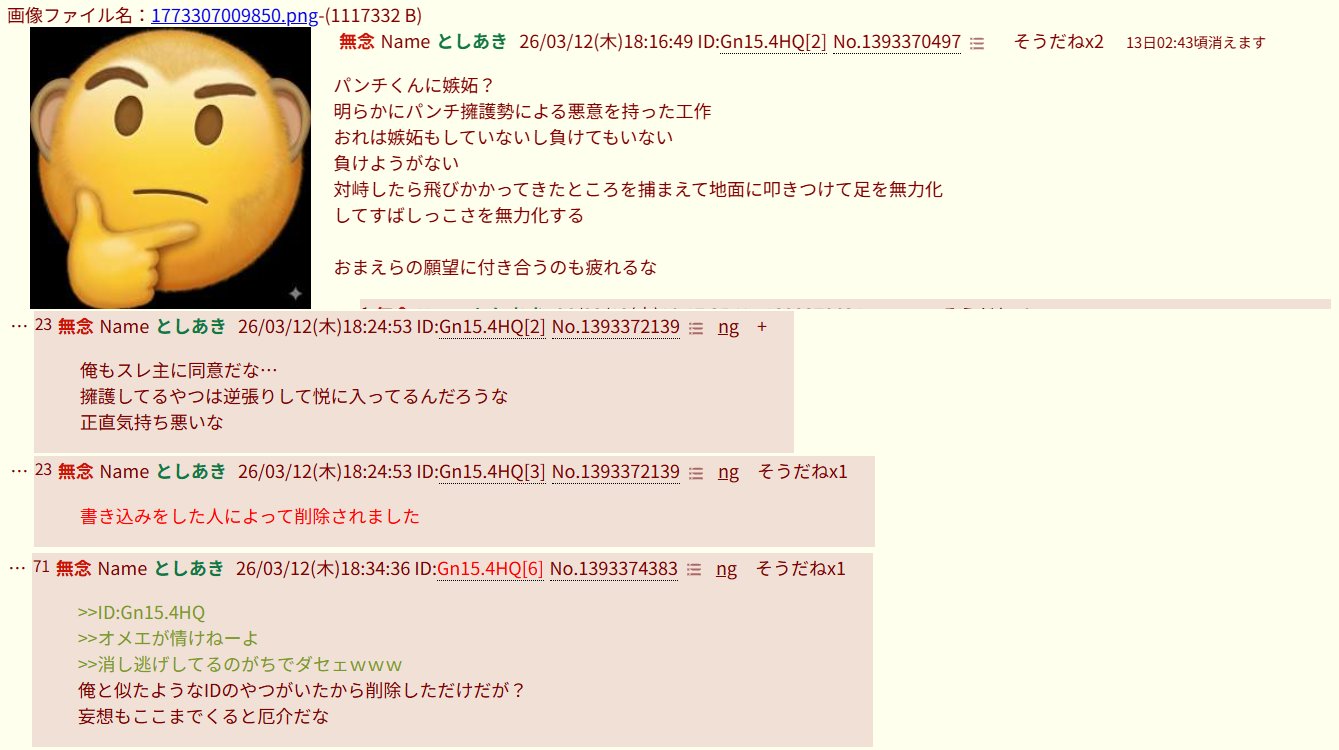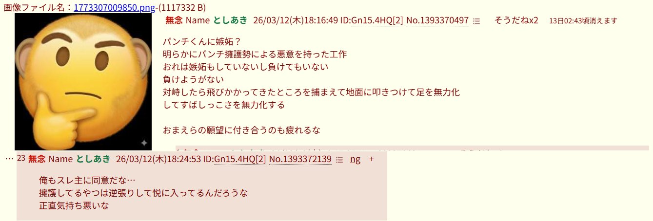 | … | 296無念Nameとしあき26/03/12(木)20:31:04No.1393403218+パンチくんに負ける荒らしって… |