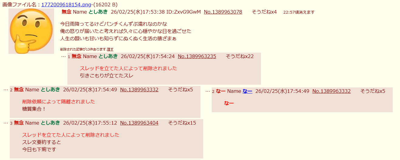| … | 79無念Nameとしあき26/03/12(木)18:35:59No.1393374685そうだねx10>俺と似たようなIDのやつがいたから削除しただけだが? |