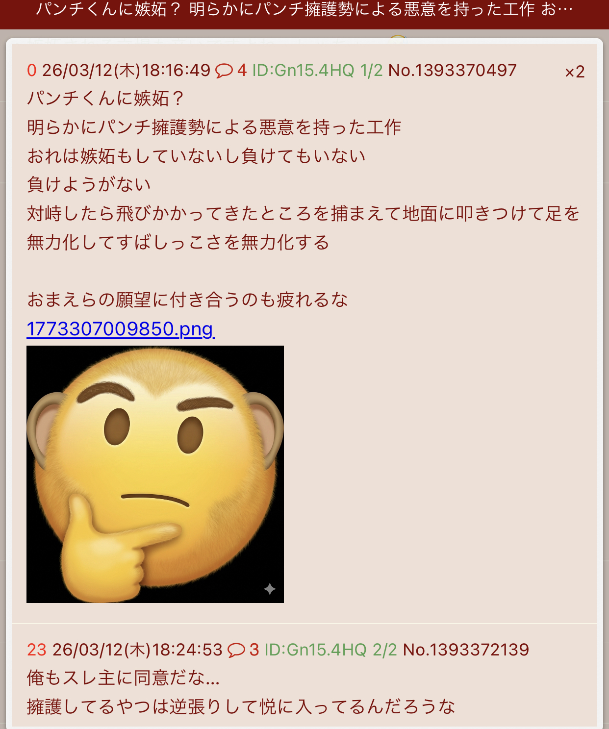 | … | 223無念Nameとしあき26/03/12(木)19:08:25No.1393382446そうだねx8ガチで子猿に嫉妬してんのかよ... |