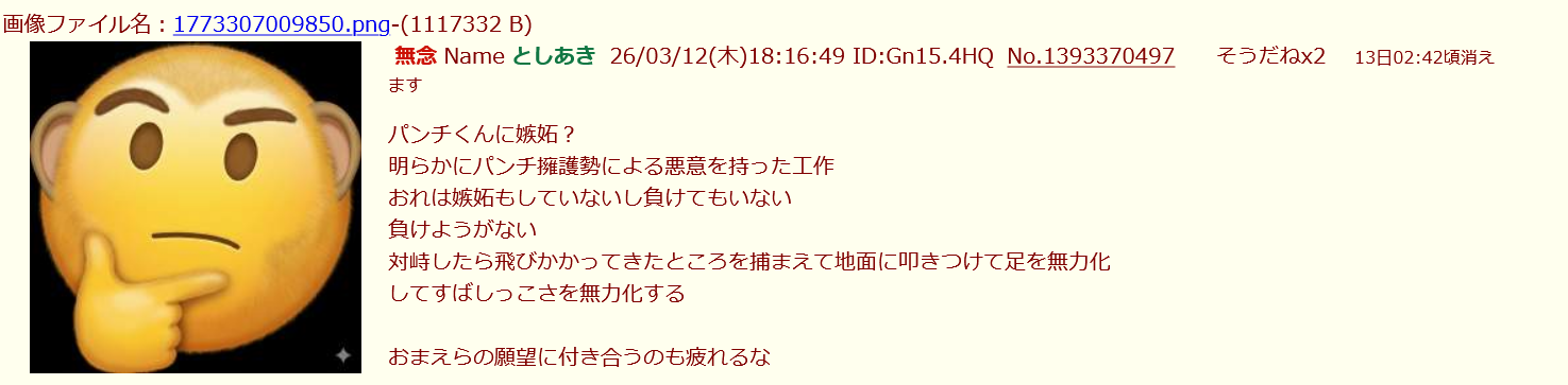 | … | 215無念Nameとしあき26/03/12(木)19:06:45No.1393382022そうだねx4まだパンチくんと同等と思い込んでるのか… |
