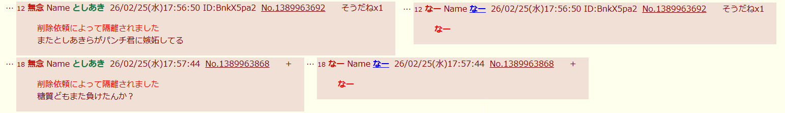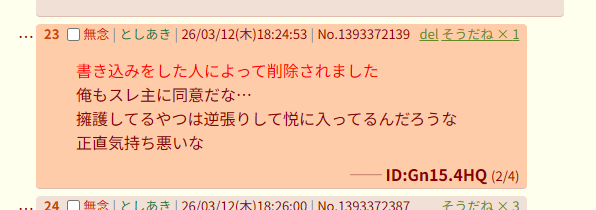 | … | 76無念Nameとしあき26/03/12(木)18:35:36No.1393374606そうだねx9>俺と似たようなIDのやつがいたから削除しただけだが? |