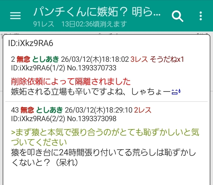 | … | 249無念Nameとしあき26/03/12(木)19:23:57No.1393386148そうだねx2猿に嫉妬するお前より気持ち悪いやつはいないよ… |