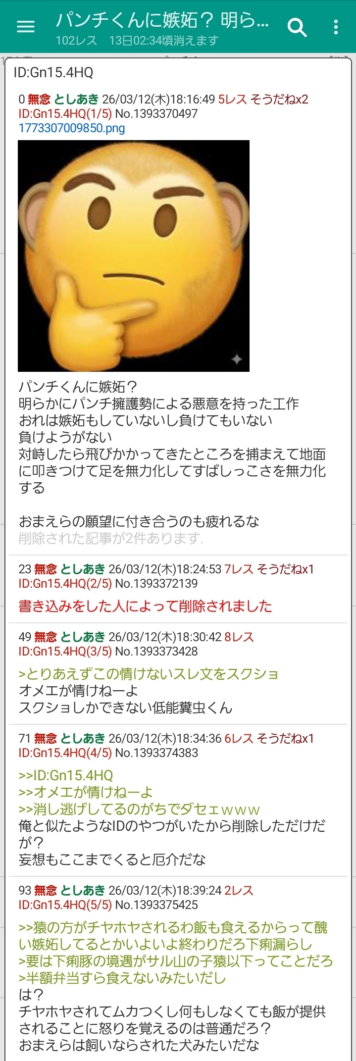 | … | 83無念Nameとしあき26/03/12(木)18:37:03No.1393374892そうだねx1>猿の方がチヤホヤされるわ飯も食えるからって醜い嫉妬してるとかいよいよ終わりだろ下痢漏らし |
