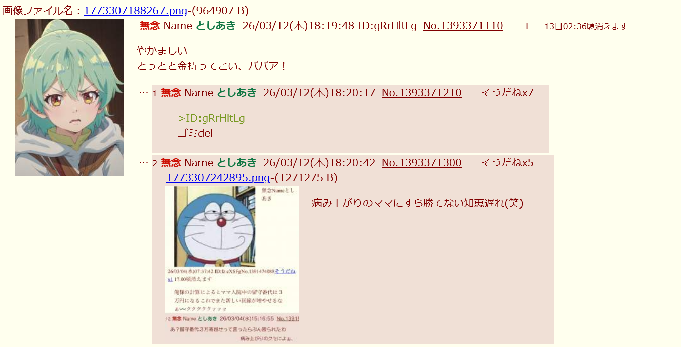 | … | 269無念Nameとしあき26/03/12(木)19:33:12No.1393388313そうだねx4>うるせーよバーカ |