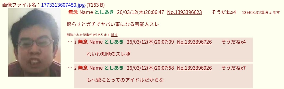 | … | 11無念Nameとしあき26/03/12(木)20:25:59No.1393401830そうだねx1>スレ爆破前の魚拓 |