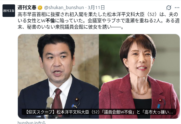 | … | 53無念Nameとしあき26/03/13(金)00:27:10No.1393457975+>自民支持者は不倫に寛容だからね |