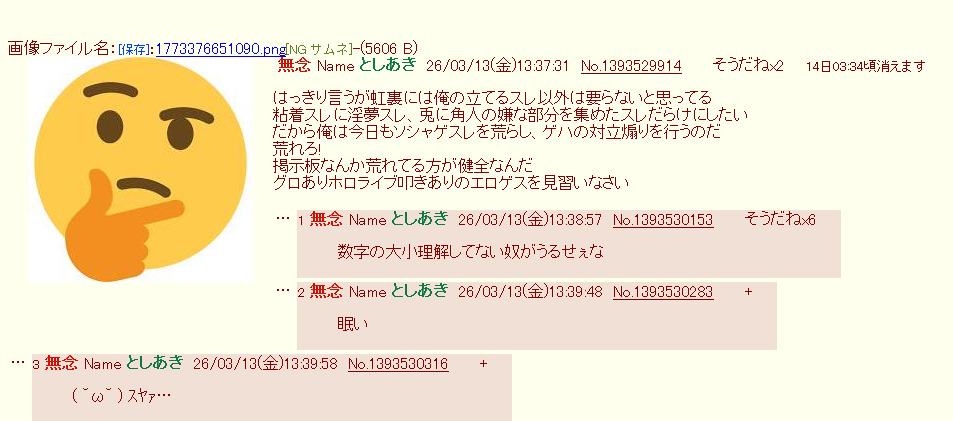 | … | 76無念Nameとしあき26/03/13(金)14:09:00No.1393534539+>荒らしとホモばっかりなんだもの |
