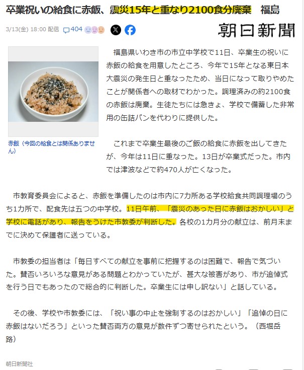 | … | 99無念Nameとしあき26/03/14(土)10:44:53No.1393714949+教育委員会が叩かれたくないから赤飯廃棄しますってだけの話 |