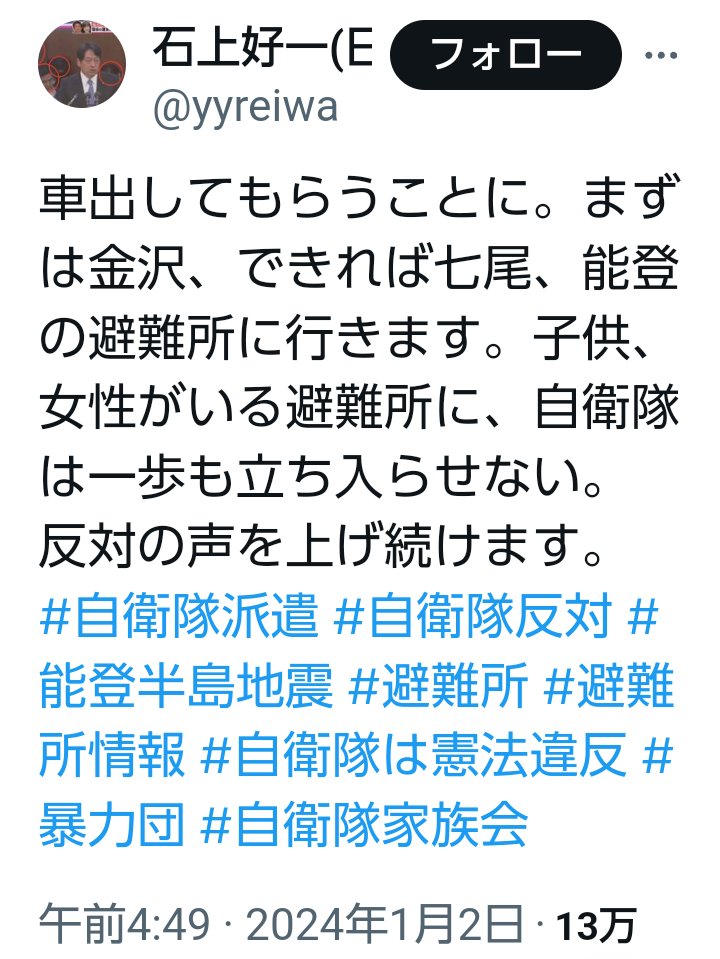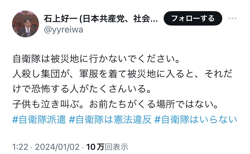 | … | 145無念Nameとしあき26/03/14(土)11:40:01No.1393724910+ 1773456001059.jpg-(130878 B) 自衛隊は被災地に来るな 共産党 |