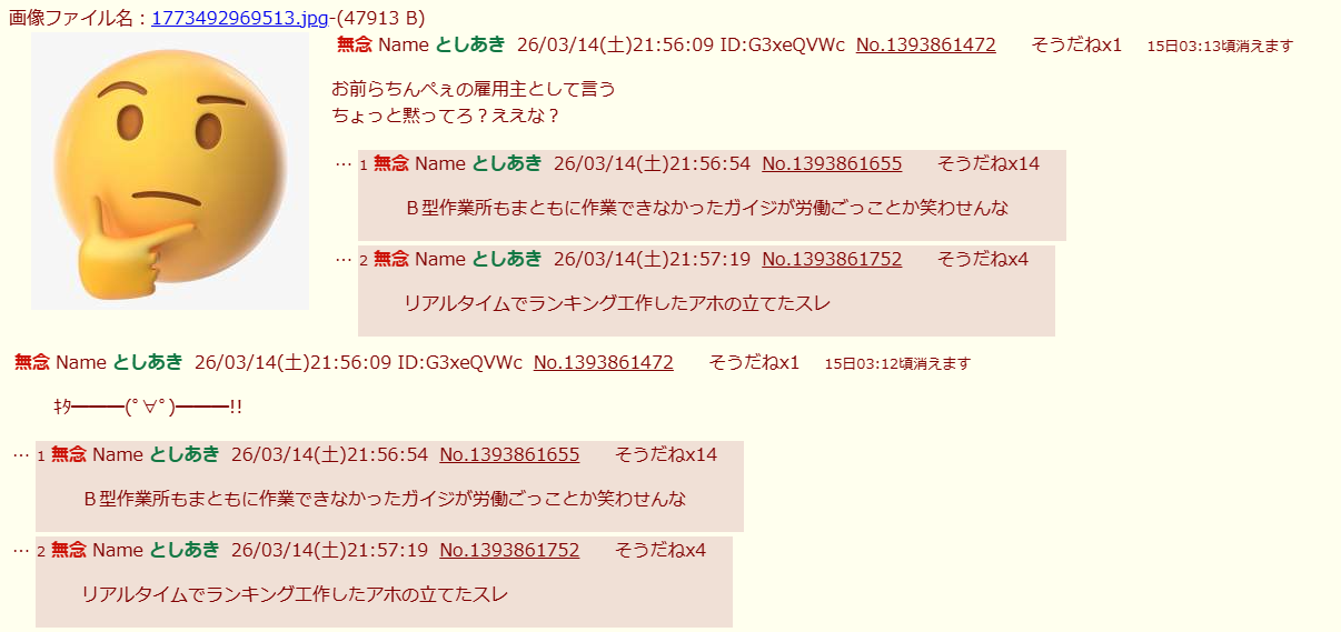 | … | 22無念Nameとしあき26/03/14(土)22:02:13No.1393863022+ 1773493333965.jpg-(323603 B) >お前らちんぺぇの雇用主として言う |