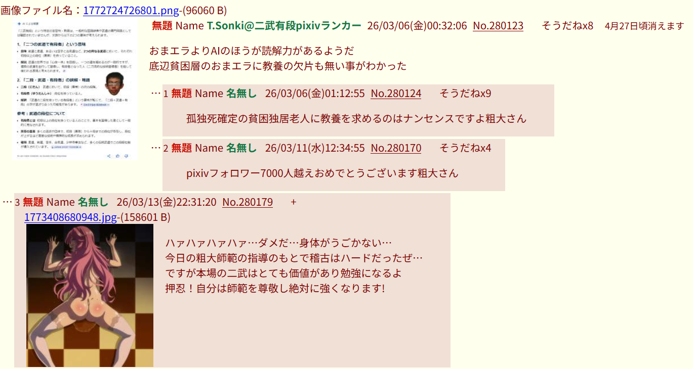 | … | 296無念Nameとしあき26/03/15(日)00:06:13No.1393891582そうだねx1>ソンキくんは逃げまわってばかりで何一つ答えられてない |