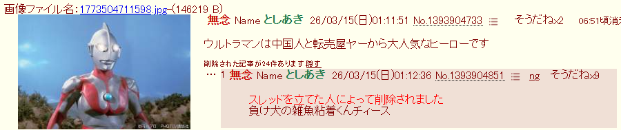 | … | 48無念Nameとしあき26/03/15(日)01:32:32No.1393908219そうだねx1>ウルトラマンは中国人と転売屋ヤーから大人気なヒーローです |