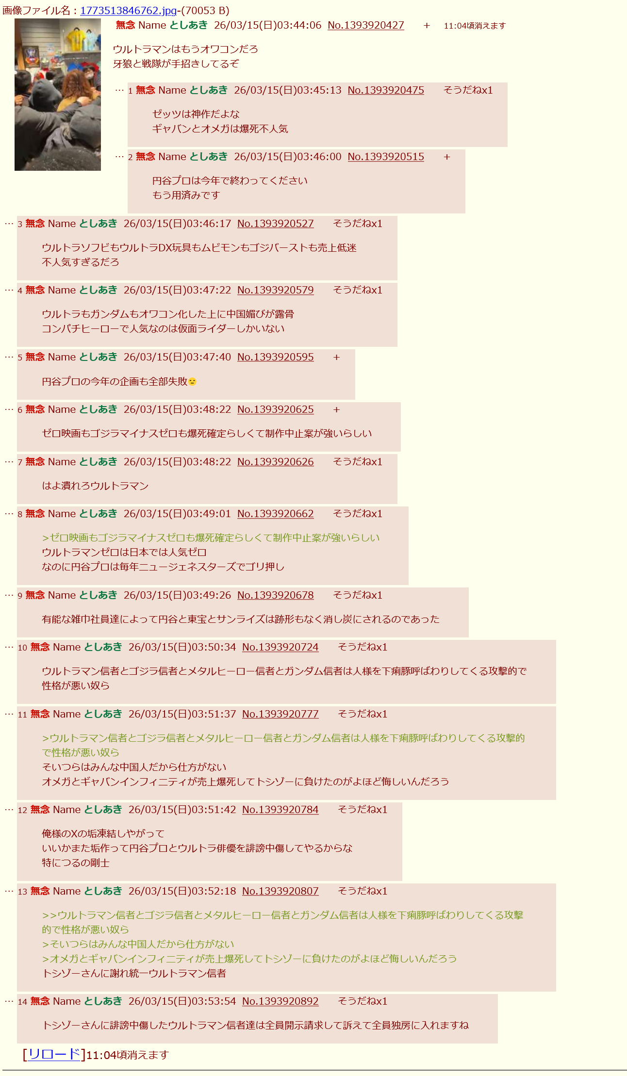 | … | 32無念Nameとしあき26/03/15(日)01:25:25No.1393907033そうだねx7>もしかしてウルトラマンのイベントも中国人と転売ヤーばかりが参加してたの? |