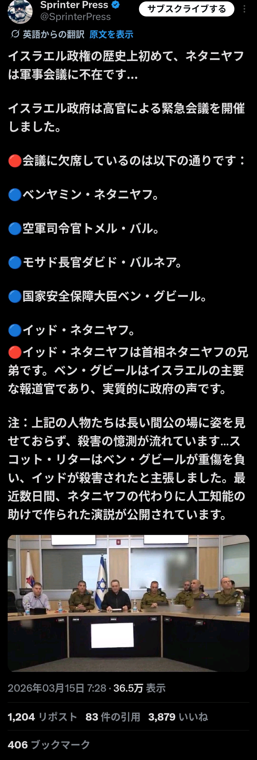| … | 930無念Nameとしあき26/03/15(日)19:58:09No.1394107044+>開戦当初もネタニヤフ死亡説を流布してたけど意味無いのにな |