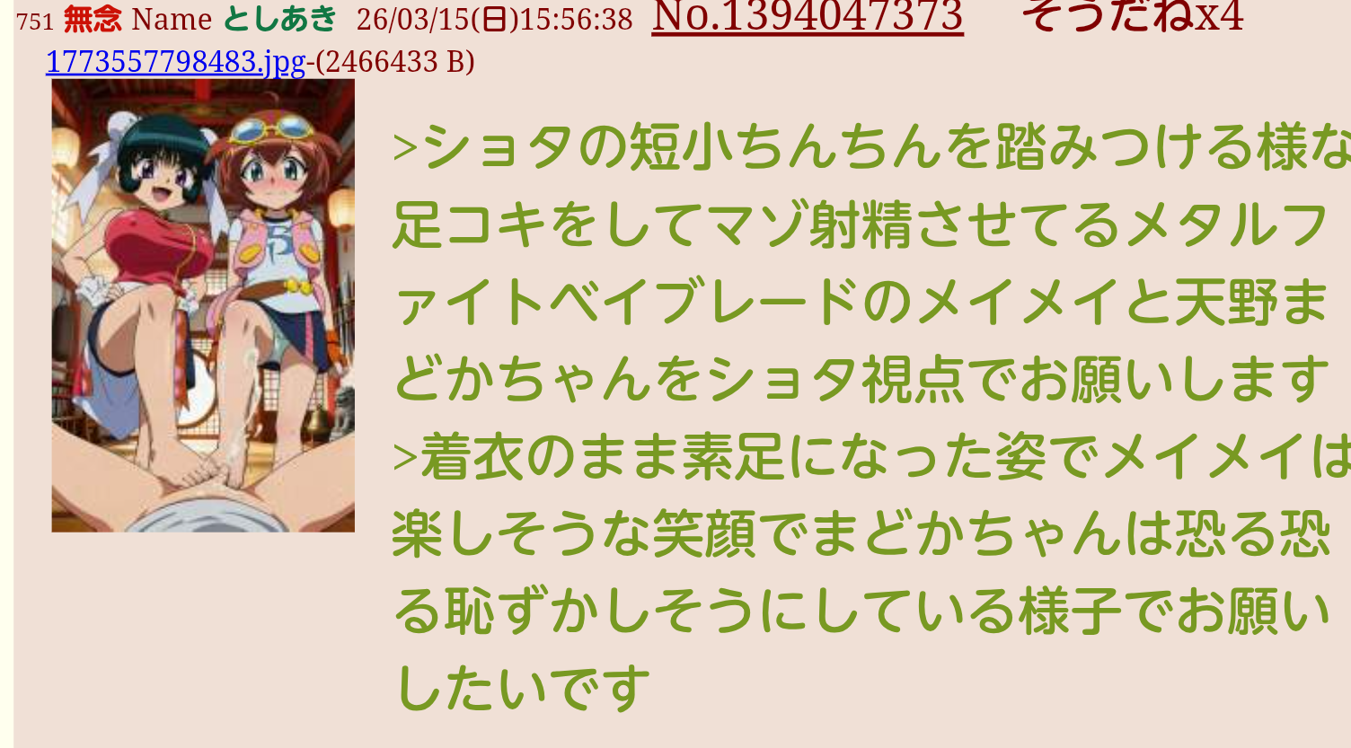 | … | 906無念Nameとしあき26/03/15(日)19:06:12No.1394093012そうだねx4 1773569172925.jpg-(512703 B) >けいおんの平沢唯か中野梓でアナルクリームパイをお願いします |