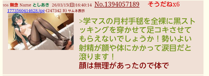 | … | 926無念Nameとしあき26/03/15(日)19:09:07No.1394093773そうだねx1 1773569347721.jpg-(557708 B) >このスレで小早川凛子リクエストしても答えてもらえない理由が生成してやっと分かったよ |