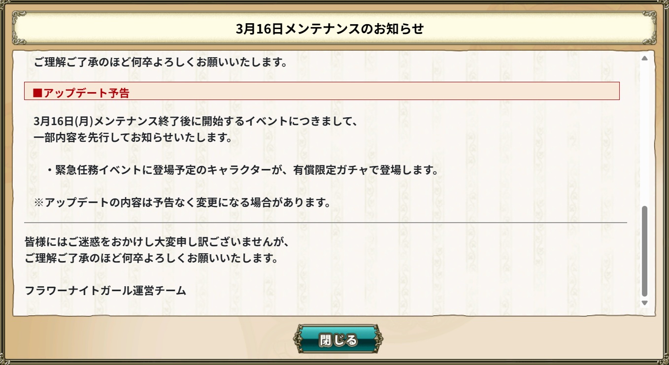 | … | 45無念Nameとしあき26/03/16(月)00:46:36 ID:zI/Be74ENo.1394180881+>花騎士はメインストーリーに緊急任務や鯨やサブまであっちこっち話が飛んで行くけど導線無くて次の話どれ?になるのだけはマジであかんと思う |
