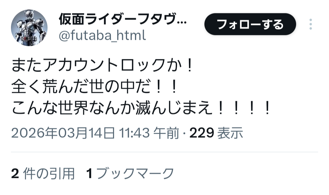 | … | 22無念Nameとしあき26/03/15(日)22:47:41No.1394156740そうだねx6https://x.com/futaba_html?s=46 |