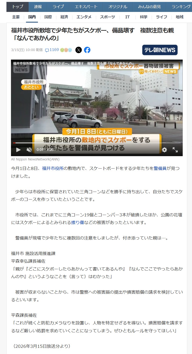 | … | 14無念Nameとしあき26/03/15(日)23:45:30No.1394170163そうだねx3>【悲報】福井市役所敷地で在日の少年たちがスケボーし備品を壊す |