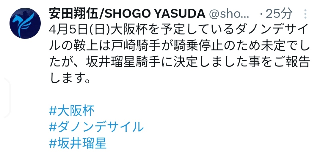 | … | 24無念Nameとしあき26/03/16(月)10:43:32No.1394221586そうだねx4ダノンデサイル、G1大阪杯の鞍上は坂井瑠星に 戸崎圭太が騎乗停止で 調教師がXで発表 |