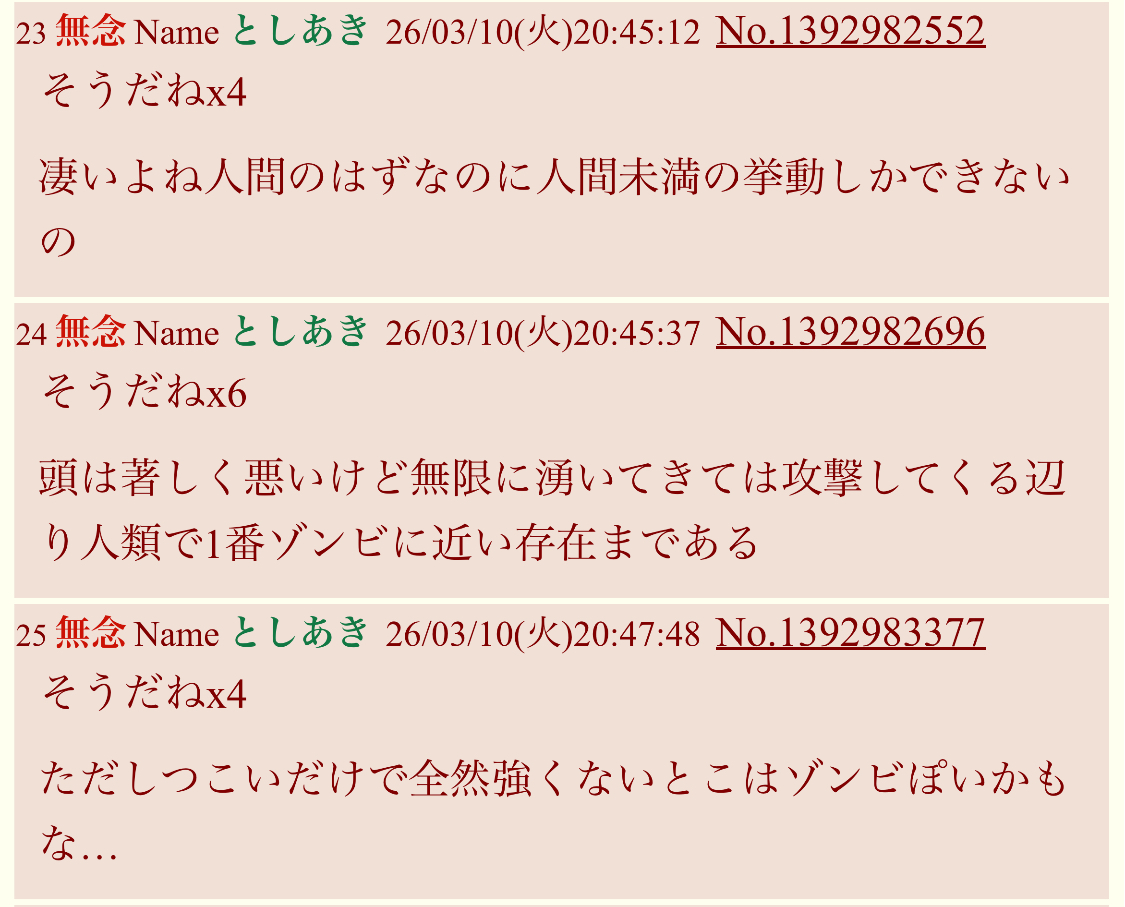 | … | 17無念Nameとしあき26/03/16(月)10:52:35 ID:0sqAV42.No.1394222715そうだねx8>あの手のスレでは阿吽の呼吸で同調する理解者だらけなんですよね |