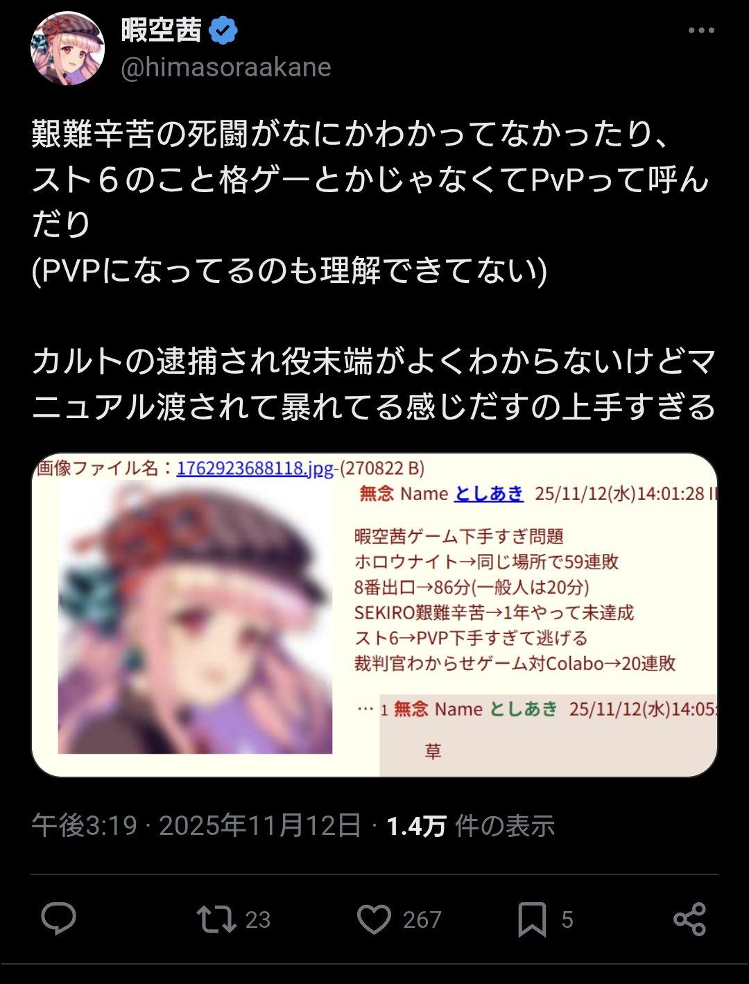| … | 52無念Nameとしあき26/03/16(月)10:26:45No.1394219332+>暇空の凄い所は全く知らないことでもホラと妄想でレスバすること |