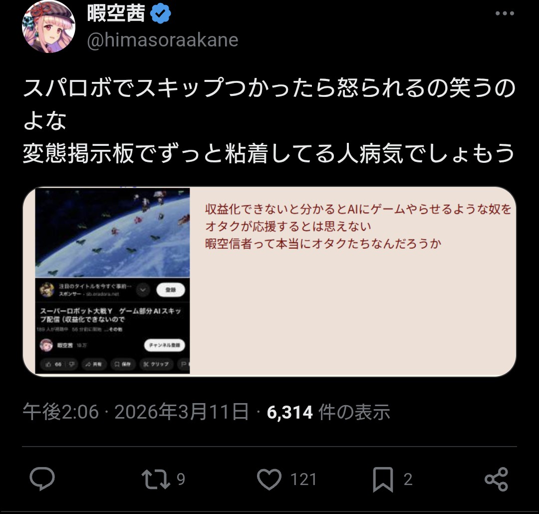 | … | 58無念Nameとしあき26/03/16(月)10:31:42 ID:V8890vq.No.1394220031そうだねx1 1773624702600.jpg-(137396 B) 最近だと収益化できないからスパロボをオートで垂れ流してたことをブチ切れてたな |