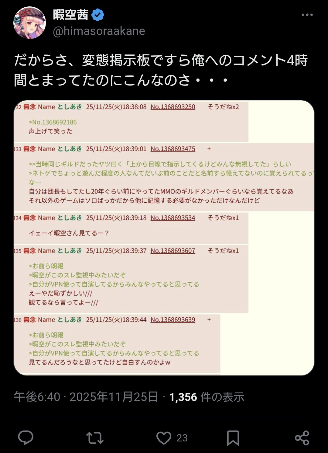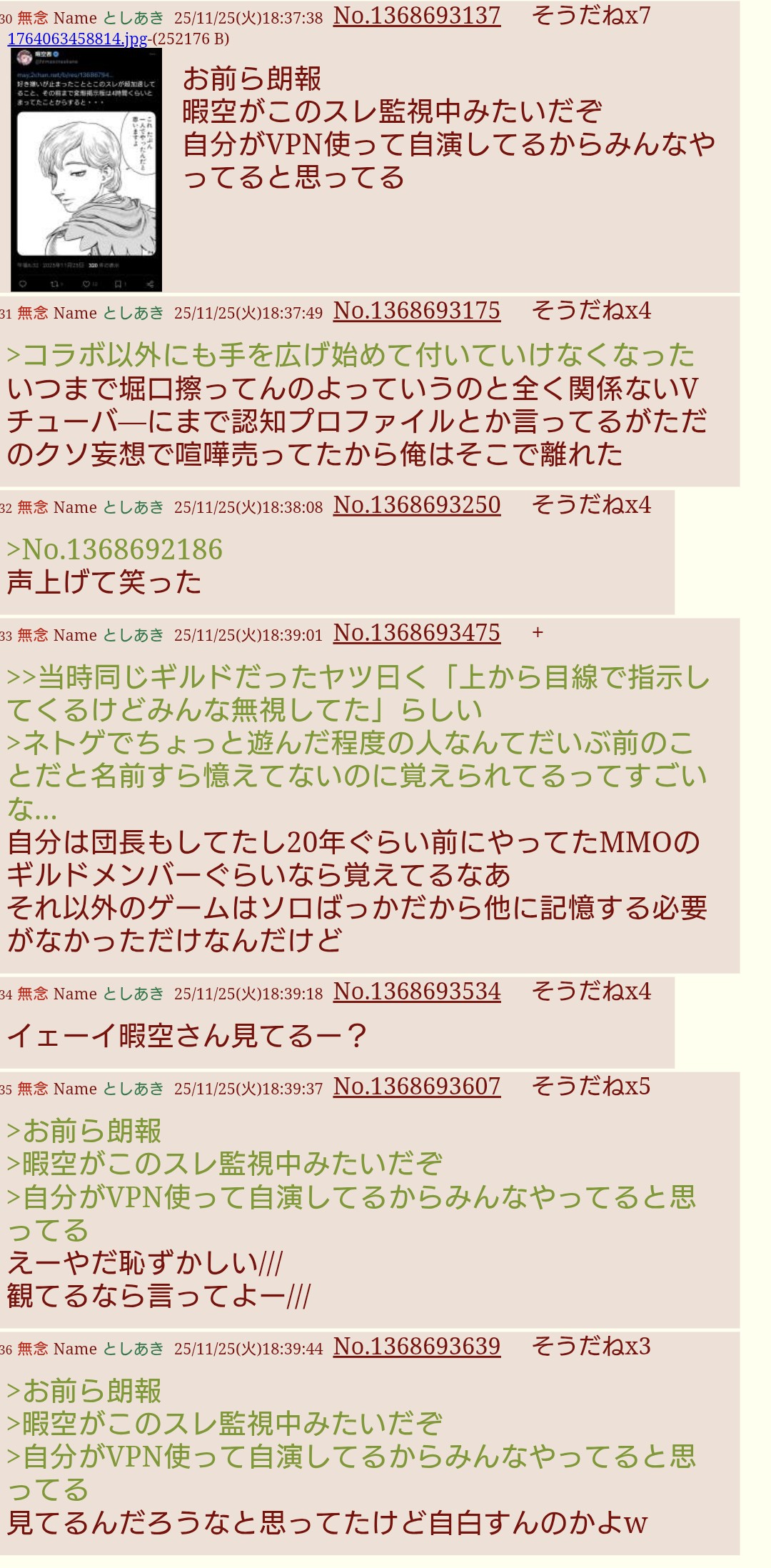 | … | 133無念Nameとしあき26/03/16(月)11:17:18No.1394225630+>毎日ふたばを監視してる暇空が |