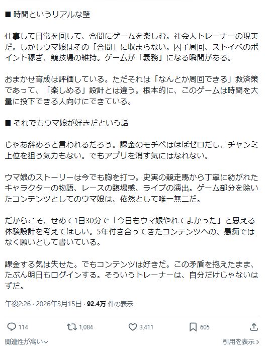| … | 254無念Nameとしあき26/03/16(月)12:21:34No.1394235583そうだねx4スレ画の言ってることはウマ娘限定じゃなくてほぼすべてのソシャゲスマホゲーに該当することだし |