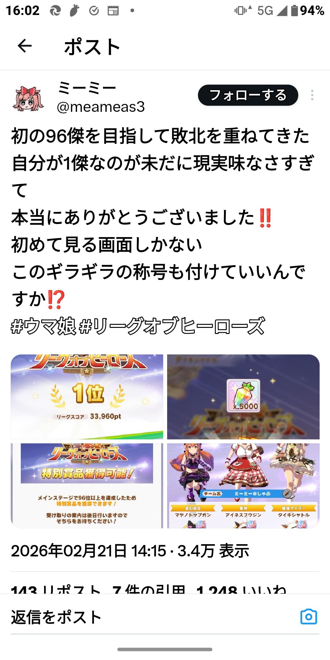 | … | 57無念Nameとしあき26/03/16(月)11:02:52No.1394223945+ウマ娘が好きだから嫌々ゲームやってる日とは大変だな |