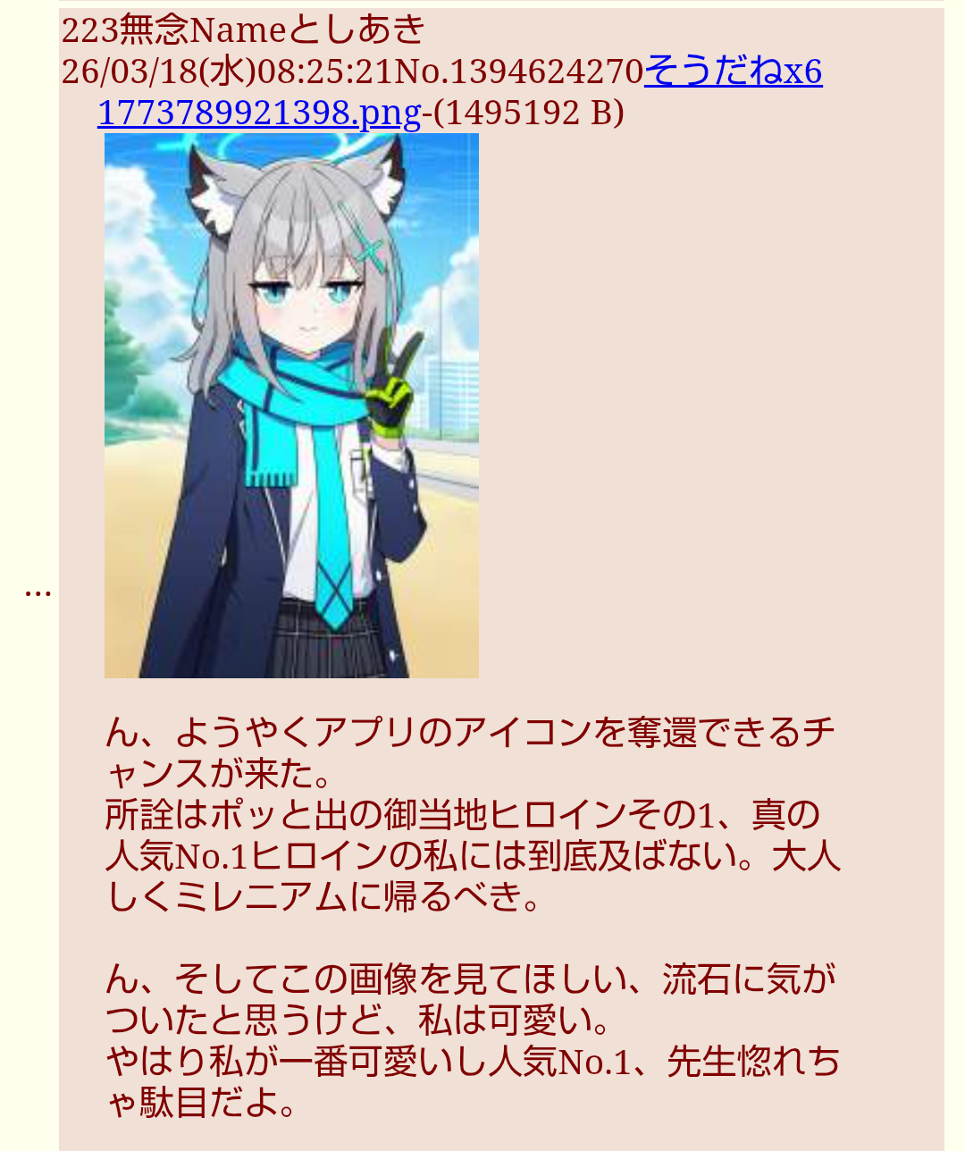 | … | 82無念Nameとしあき26/03/18(水)13:01:20No.1394667454そうだねx6>ブルアカと同じノリで創作やってたらキャラを大事にしてないと見做されて村八分スルーされるようになっただけ |