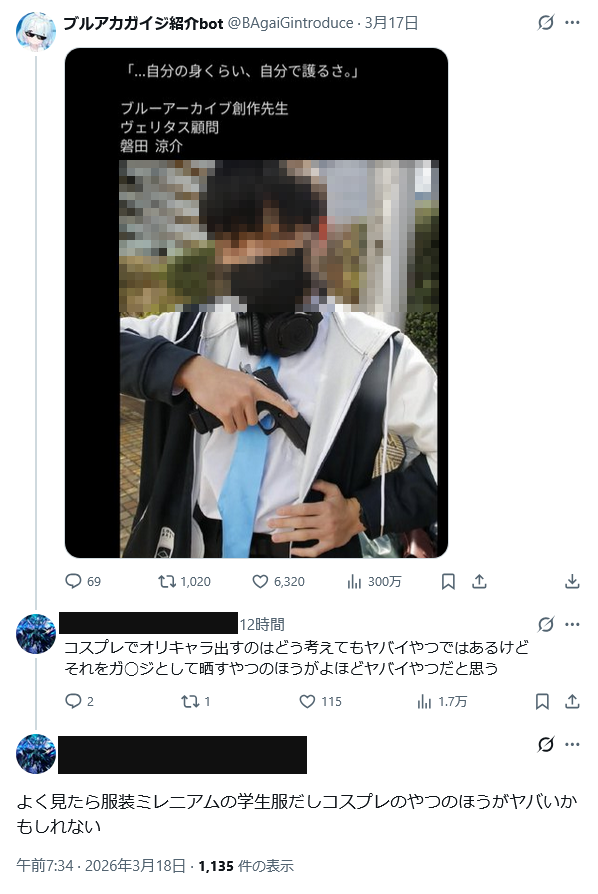 | … | 2無念Nameとしあき26/03/18(水)12:14:54No.1394656926そうだねx7 1773803694630.jpg-(20954 B) >>ブルアカのコスプレすげぇなオリキャラまであるんだ |