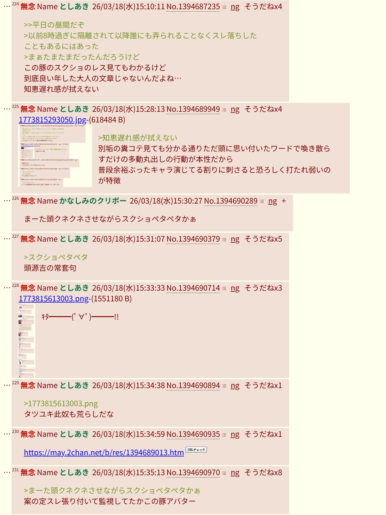| … | 395無念Nameとしあき26/03/18(水)18:47:26No.1394724484そうだねx1誤爆馬鹿にされたからか精神雑談(豚お断り)スレにここのリンク連騰始めてやがる |