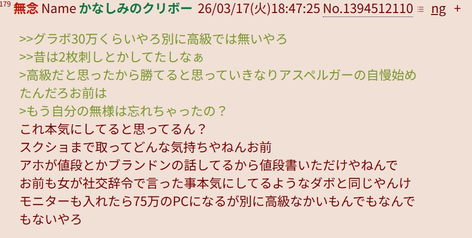 | … | 22無念Nameとしあき26/03/18(水)16:11:41No.1394696270+こちらがちょっとした見栄張るだけでも発狂する豚って一体… |