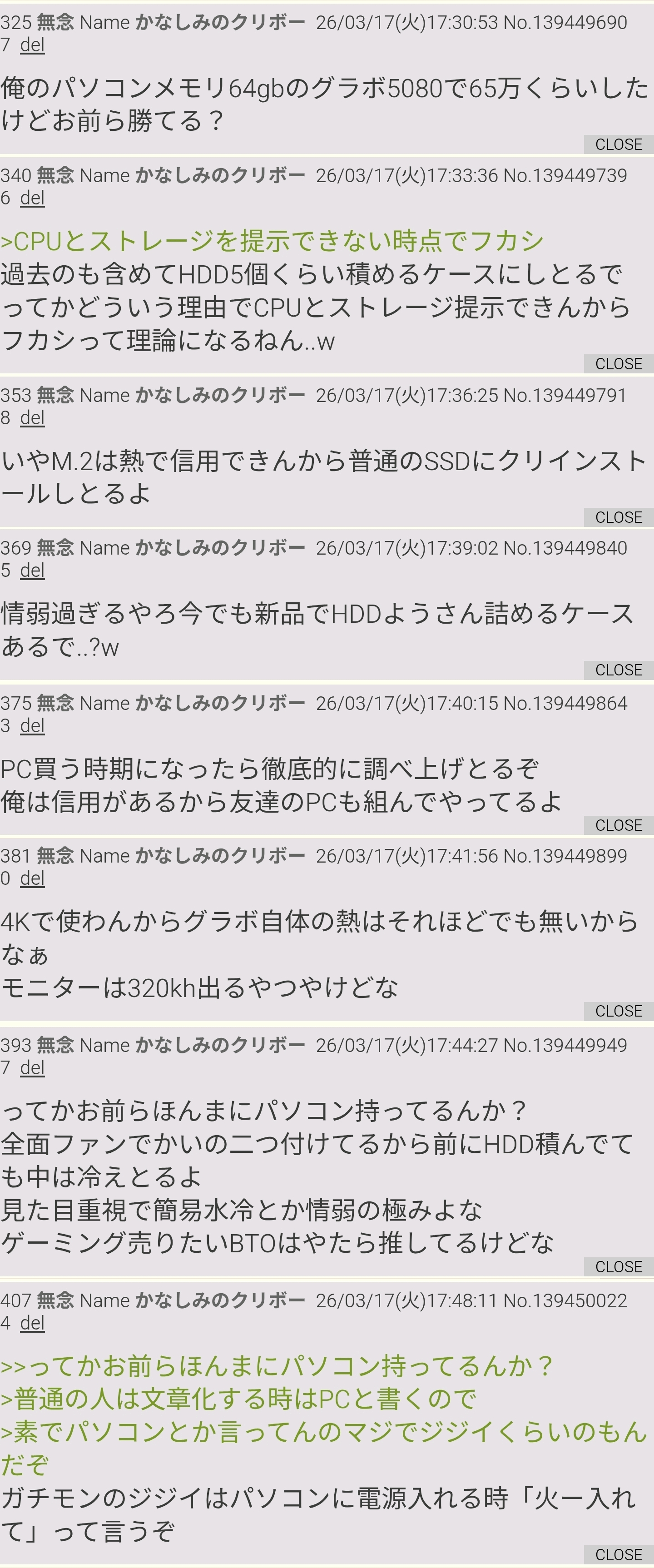 | … | 423無念Nameかなしみのクリボー26/03/18(水)19:44:30No.1394738585+>3.5インチHDDは冷却の邪魔になるから発熱量が大きいPCに積まない |