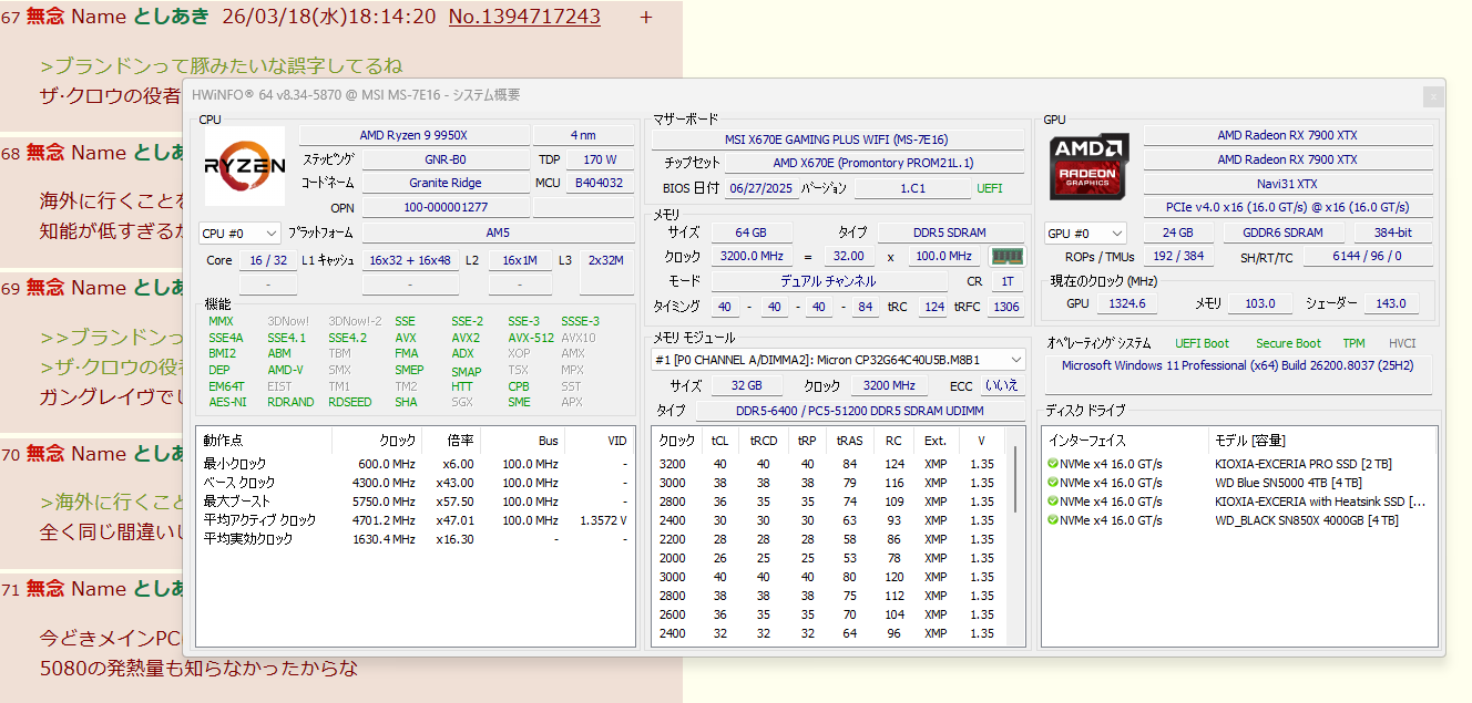 | … | 371無念Nameとしあき26/03/18(水)18:17:43No.1394718016+今どきメインPCにHDDを積まないことすら知らないし |