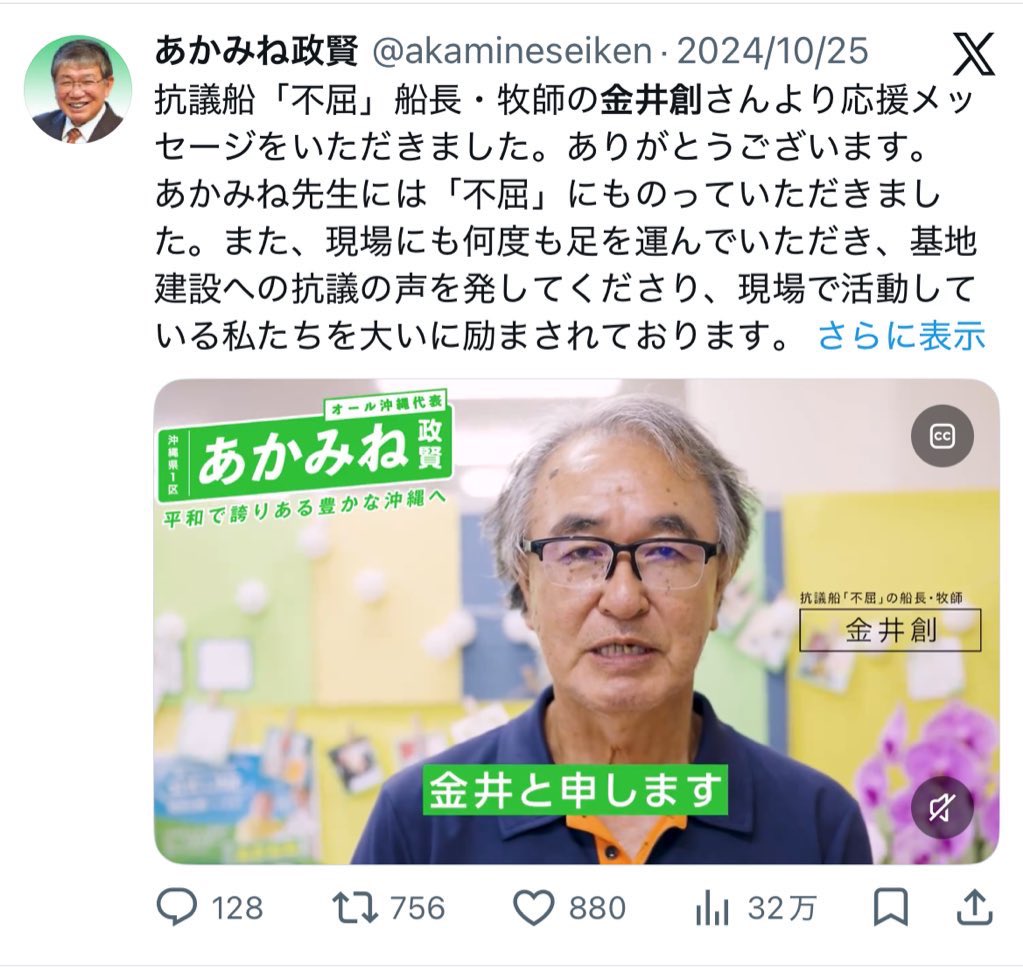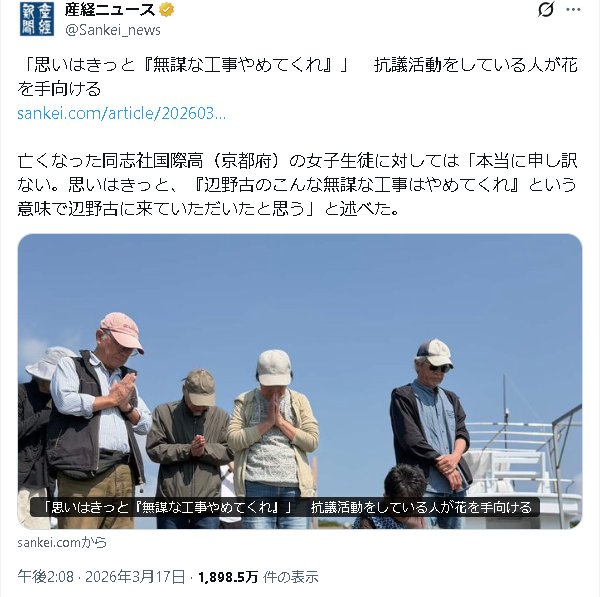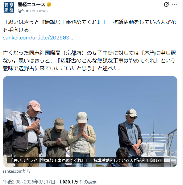 | … | 61無念Nameとしあき26/03/18(水)20:08:25No.1394745256+>>「本当に申し訳ない。思いはきっと、『辺野古のこんな無謀な工事はやめてくれ』という意味で辺野古に来ていただいたと思う」 |
