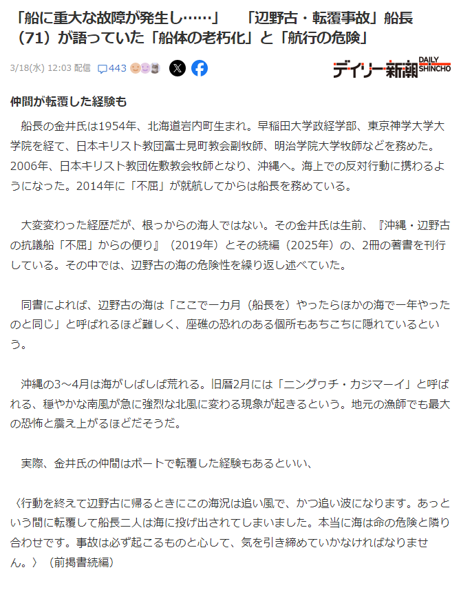 | … | 979無念Nameとしあき26/03/18(水)21:28:31No.1394766509+さらに安心できないからって海保の船があとでもう一回現場の確認言ってるんだよね |