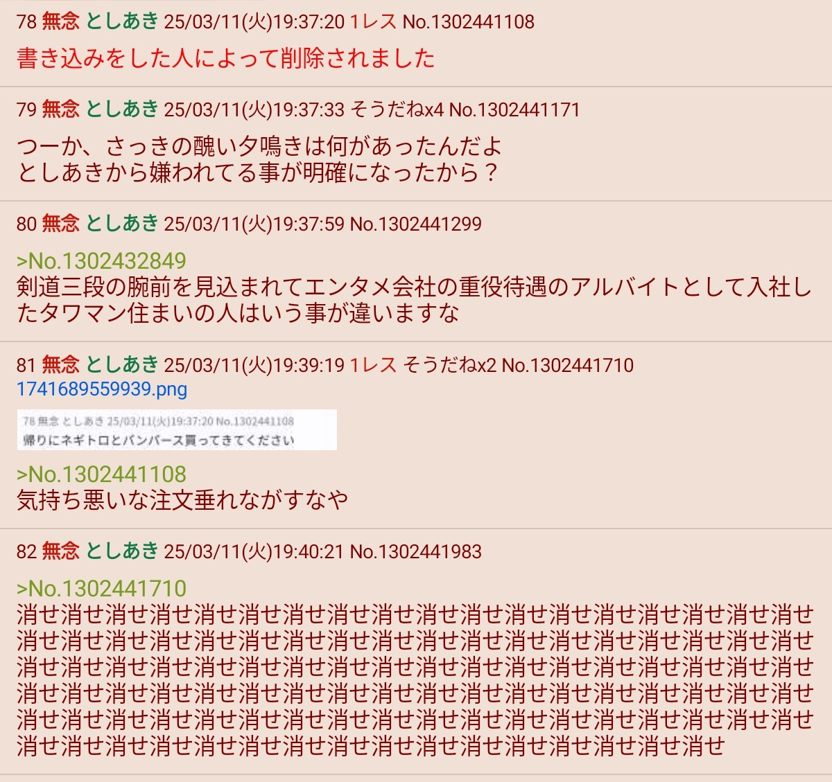 | … | 6無念Nameとしあき26/03/18(水)20:37:54No.1394753016+>ふたば全域を荒らしてる有名な荒らしが「ネギトロとパンパース買ってきてください」て誤爆してた |