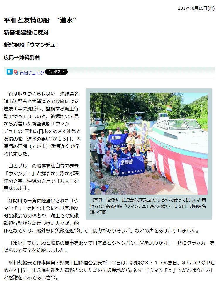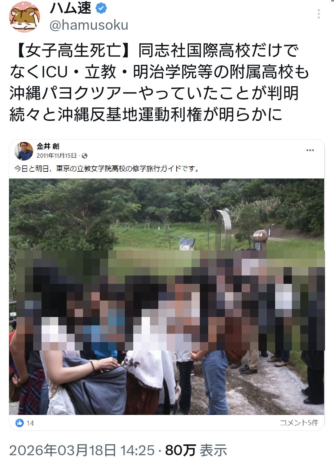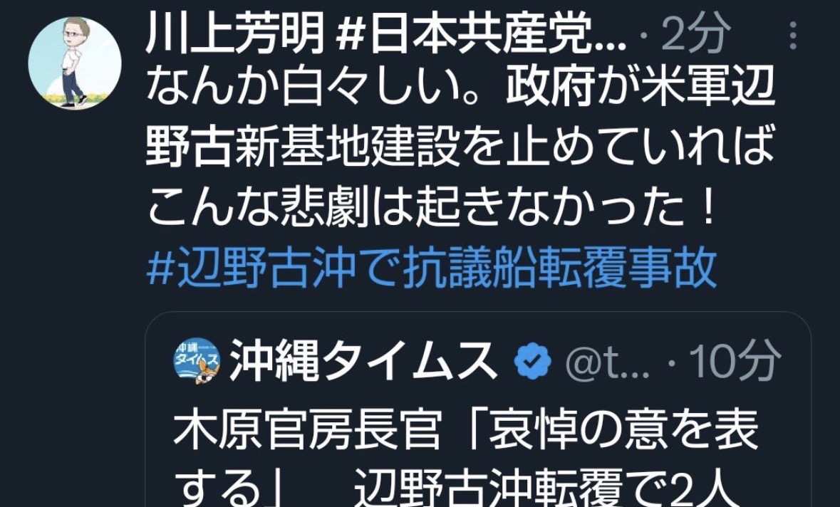 | … | 41無念Nameとしあき26/03/18(水)20:58:47No.1394758555そうだねx10>沖縄辺野古沖で船2隻が転覆し、「不屈」の船長と同志社国際高生徒が死亡した。私は同志社大教授を20年務めたが、同校は沖縄で平和学習をしていた。ネトウヨが、新基地反対闘争が続く辺野古での学習を非難しているが、反対派を敵視する海保が速やかに救助したか検証が必要だ |