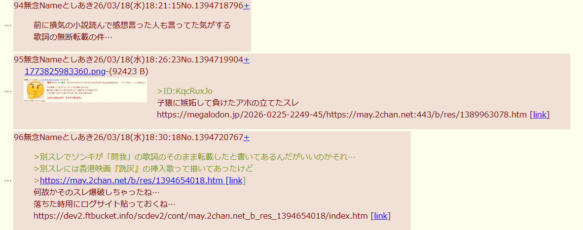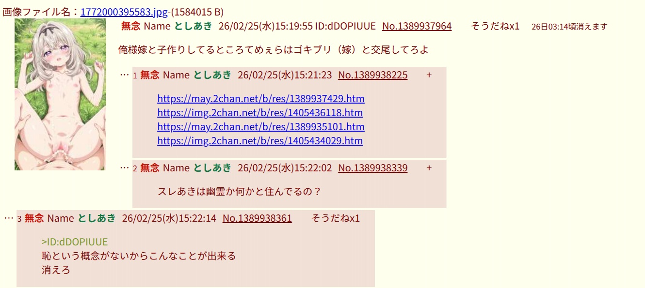 | … | 264無念Nameとしあき26/03/18(水)23:29:34No.1394796657+>自分で立てたスレのURL貼り付けコピペしてるのか |