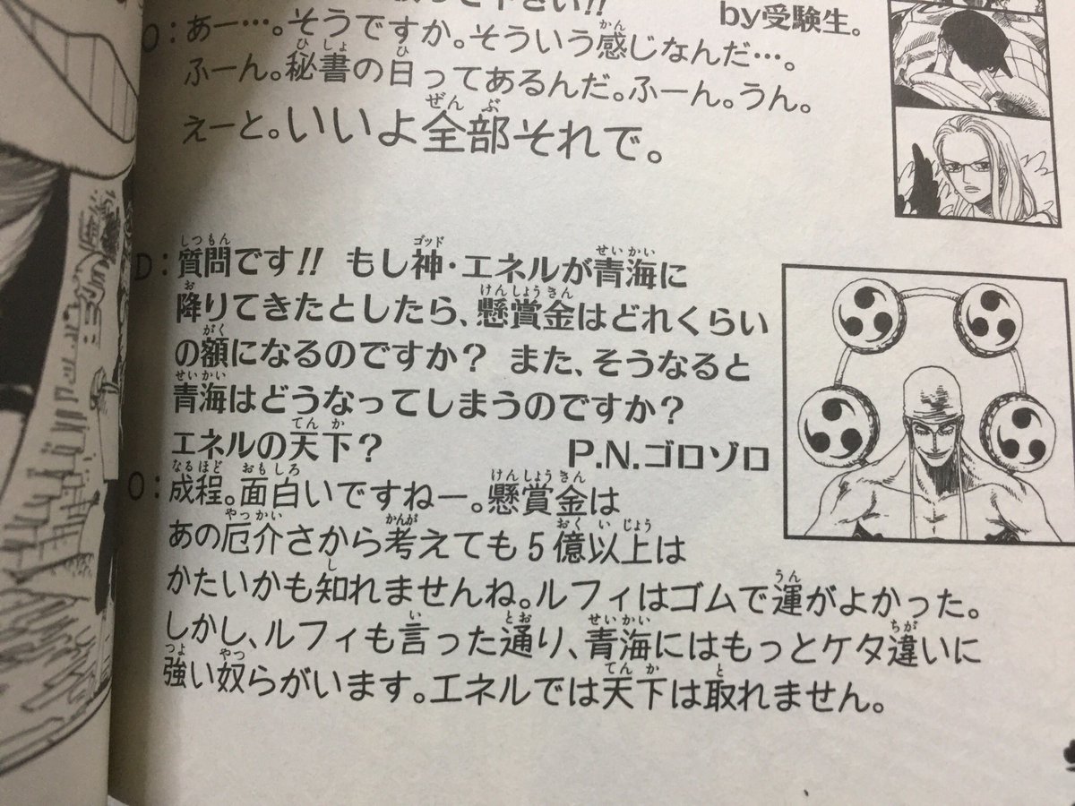 | … | 39無念Nameとしあき26/03/18(水)22:57:52No.1394789552そうだねx1エネル最強説とか根強かったけど尾田先生から青海にはもっと強いのいるから天下は取れないよーって答えあって |