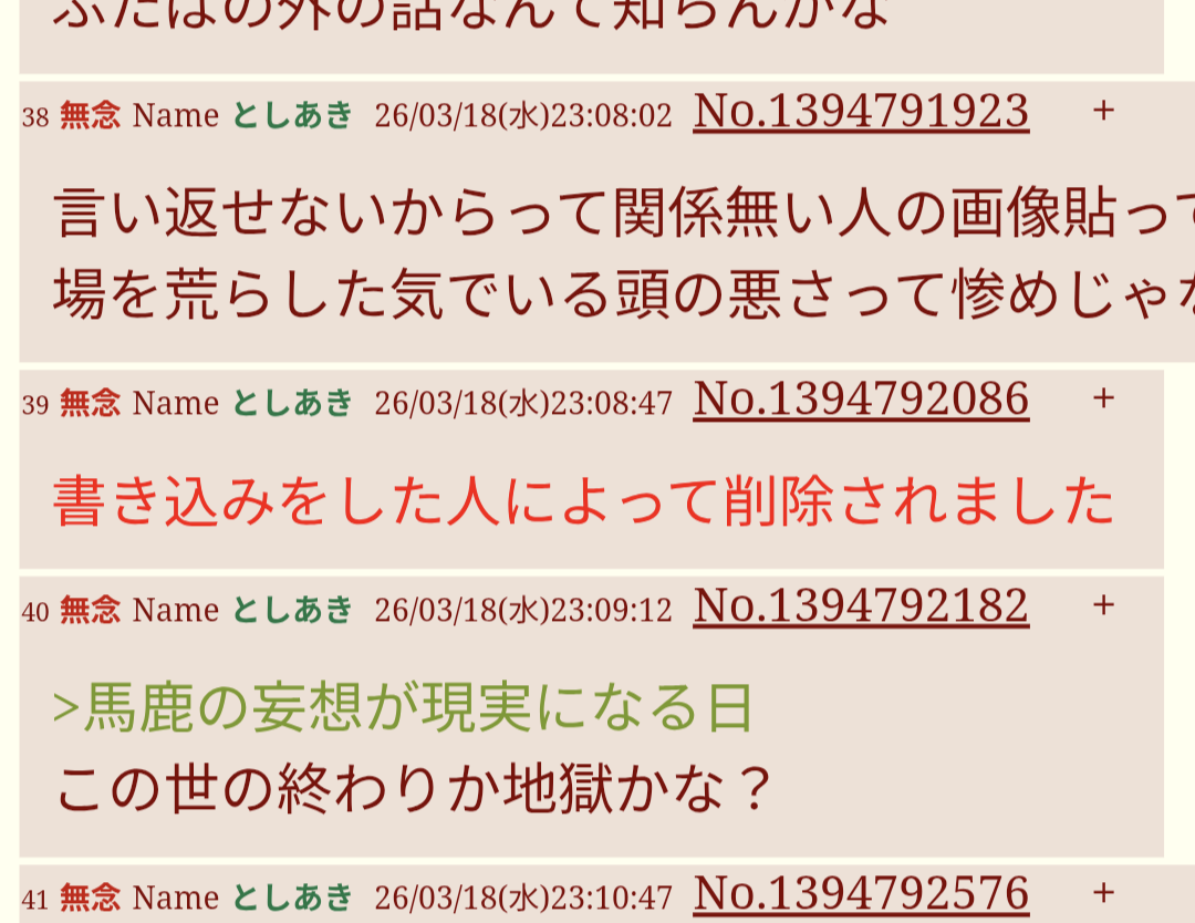 | … | 38無念Nameとしあき26/03/18(水)23:08:02No.1394791923+言い返せないからって関係無い人の画像貼って |