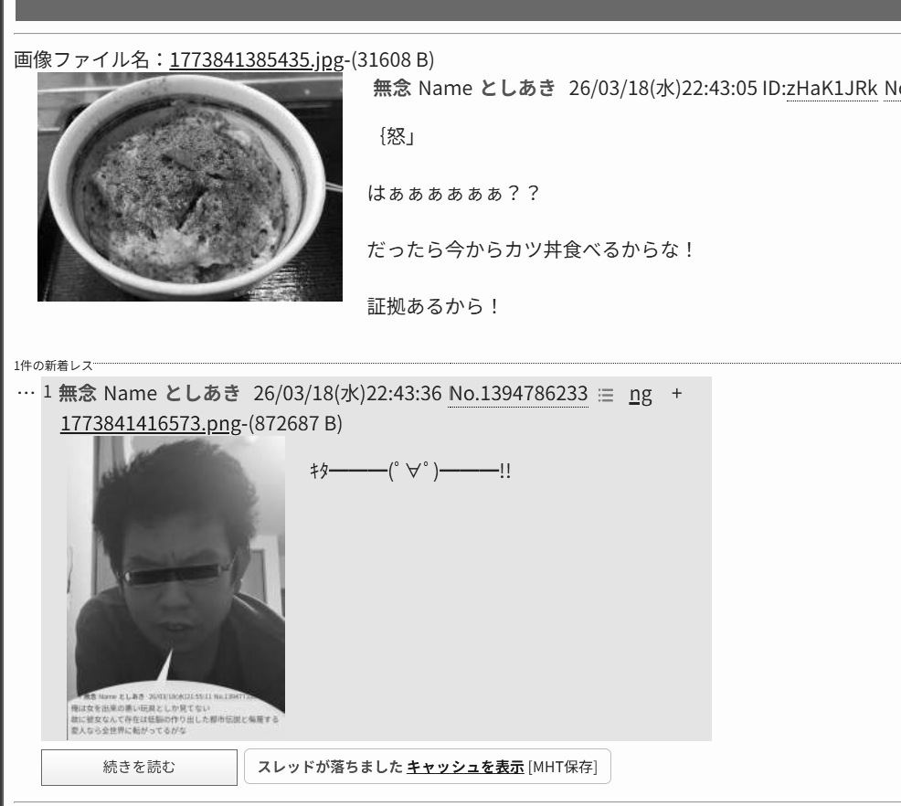 | … | 59無念Nameとしあき26/03/19(木)00:35:56No.1394810151+カツ丼喰ってる場合じゃねえだろwww |